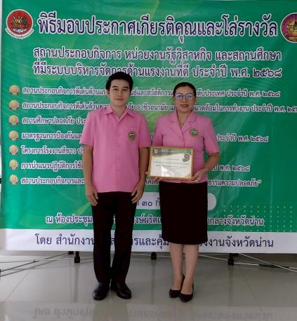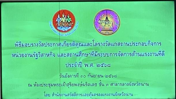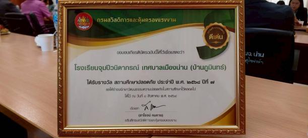วันที่ 30 กันยายน 2568 นางพิลาสินี ถาริยะวงศ์วนิช ผู้อำนวยการสถานศึกษา พร้อมด้วยนายสรกฤช พรมสะวะนา ครูวิทยฐานะครูชำนาญการพิเศษ เป็นผู้แทนโรงเรียนจุมปีวนิดาภรณ์ เทศบาลเมืองน่าน (บ้านภูมินทร์) เข้ารับ รางวัลสถานศึกษาปลอดภัย ประจำปี พ.ศ. 2568 ต่อเนื่องเป็นปีที่ 7 จากกรมสวัสดิการและคุ้มครองแรงงาน โดยมี นายชัยนรงค์ วงศ์ใหญ่ ผู้ว่าราชการจังหวัดน่าน เป็นประธานมอบรางวัล ณ ห้องประชุมพระเจ้าสุริยพงษ์ผริตเดช ชั้น 3 ศาลากลางจังหวัดน่าน