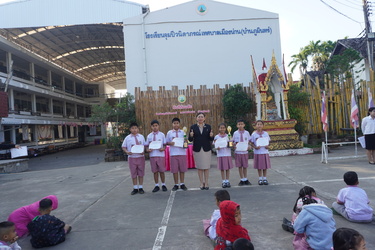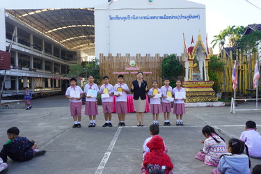 นางพิลาสินี ถาริยะวงศ์วนิช ผู้อำนวยการสถานศึกษา เป็นตัวแทนของ บริษัท เสริมปัญญา จำกัด มอบโล่รางวัลและทุนการศึกษาในโครงการทดสอบความรู้ วิชาสังคมศึกษา ให้แก่นักเรียนที่มีผลการสอบยอดเยี่ยม ดังนี้