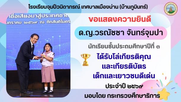 📢 วันที่ 8 มกราคม 2569 เด็กหญิงวรณัชชา จันทร์จุมปา นักเรียนระดับชั้นประถมศึกษาปีที่ 3 โรงเรียนจุมปีวนิดาภรณ์ เทศบาลเมืองน่าน (บ้านภูมินทร์) เข้ารับโล่เกียรติคุณและเกียรติบัตร “เด็กและเยาวชนดีเด่น” ประจำปี 2569 โดยได้รับเกียรติจากนายองอาจ วงษ์ประยูร รัฐมนตรีช่วยว่าการกระทรวงศึกษาธิการ เป็นผู้มอบรางวัล ณ ตึกสันติไมตรี (หลังนอก) ทำเนียบรัฐบาล
