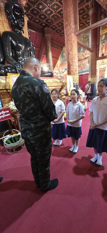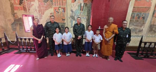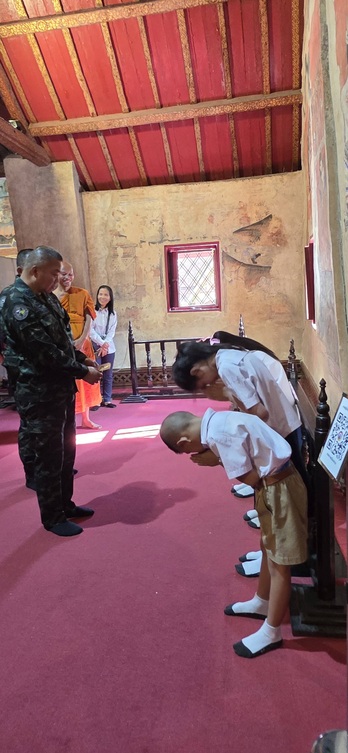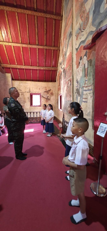 ⏰ เวลา 15.50 น. นางพิลาสินี ถาริยะวงศ์วนิช ผู้อำนวยการโรงเรียนจุมปีวนิดาภรณ์ เทศบาลเมืองน่าน (บ้านภูมินทร์) มอบหมายให้ นางสาวบุญาณิส แซ่แต็น ครู คศ.3 นำนักเรียนเจ้าบ้านน้อยโรงเรียนจุมปีวนิดาภรณ์ฯ ทำหน้าที่ต้อนรับและถ่ายทอดองค์ความรู้เกี่ยวกับวัดภูมินทร์ ให้แก่ พลเอก บุญสิน พาดกลาง นายทหารราชองครักษ์พิเศษ ณ วัดภูมินทร์ อำเภอเมืองน่าน จังหวัดน่าน