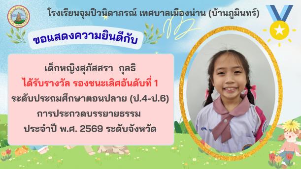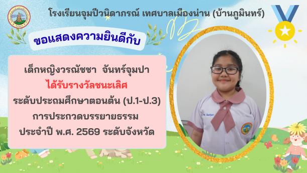 📢 วันที่ 16 มีนาคม 2569 โรงเรียนจุมปีวนิดาภรณ์ เทศบาลเมืองน่าน (บ้านภูมินทร์) นำโดย นางพิลาสินี ถาริยะวงศ์วนิช ผู้อำนวยการสถานศึกษา นายอนุรักษ์ กาญกาวี รองผู้อำนวยการสถานศึกษา พร้อมด้วยคณะครู ร่วมแสดงความยินดีกับนักเรียนที่ได้รับรางวัลจาก การประกวดบรรยายธรรม ประจำปี พ.ศ. 2569 ระดับจังหวัด ซึ่งจัดโดยสำนักงานวัฒนธรรมจังหวัดน่าน โดยมีผลการประกวด ดังนี้
