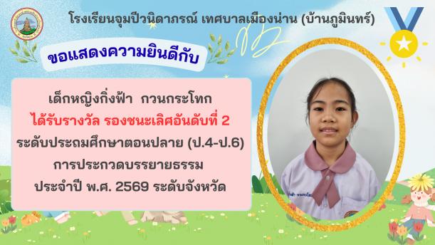 🌟เด็กหญิงกิ่งฟ้า กวนกระโทก ได้รับรางวัล รองชนะเลิศอันดับที่ 2 ระดับประถมศึกษาตอนปลาย (ป.4–ป.6)