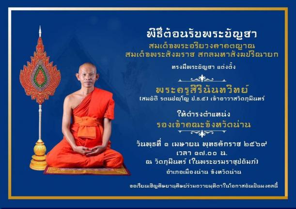 ในการนี้ นางพิลาสินี ถาริยะวงศ์วนิช ผู้อำนวยการสถานศึกษา มอบหมายให้ นายอนุรักษ์ กาญกาวี รองผู้อำนวยการสถานศึกษา นำตัวแทนครูเข้าร่วมพิธีดังกล่าว เพื่อร่วมแสดงความยินดีและน้อมถวายมุทิตาจิต เนื่องในโอกาสสำคัญทางคณะสงฆ์ของจังหวัดน่าน